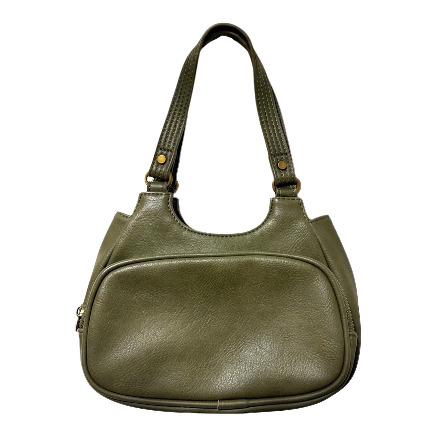 オリーブグリーンの合成皮革製ハンドバッグ、シンプルで丸みを帯びたデザインが特徴。